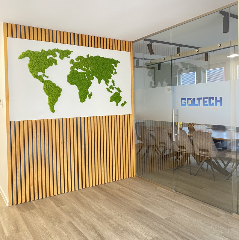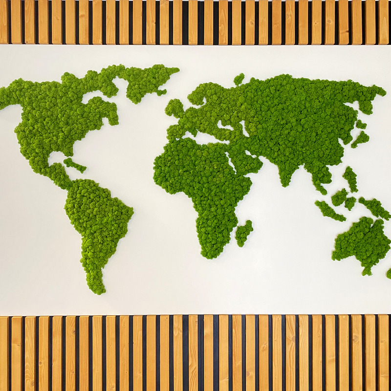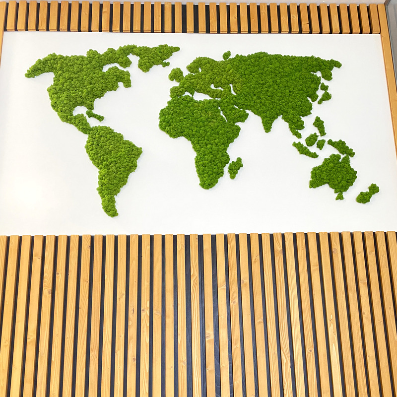 MAPA SVETA je impozantná dekorácia, na ktorej je celý svet vykreslený pomocou rôznych druhov machu. Kontinenty sú z tmavších odtieňov, oceány z jemnejších farieb. Tento dizajn sa hodí do kancelárií, škôl, ale aj do domácich pracovní. Stena má akustické vlastnosti a je úplne bezúdržbová.