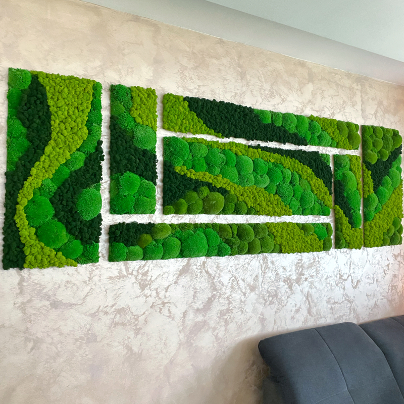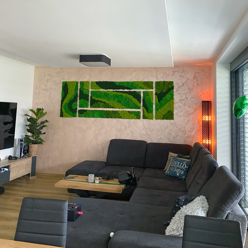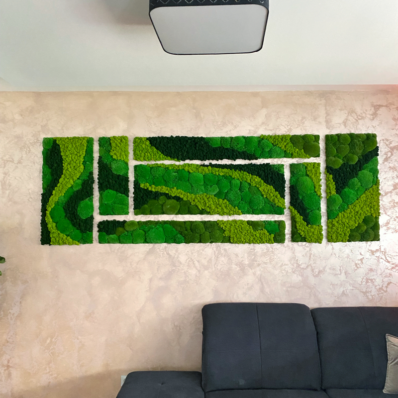 Jedinečné a originálne, ručne vyrábané interierové steny z machu. Druh a farbu machu vieme prispôsobiť vašim individuálnym požiadavkám.