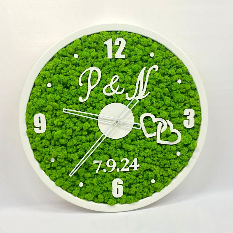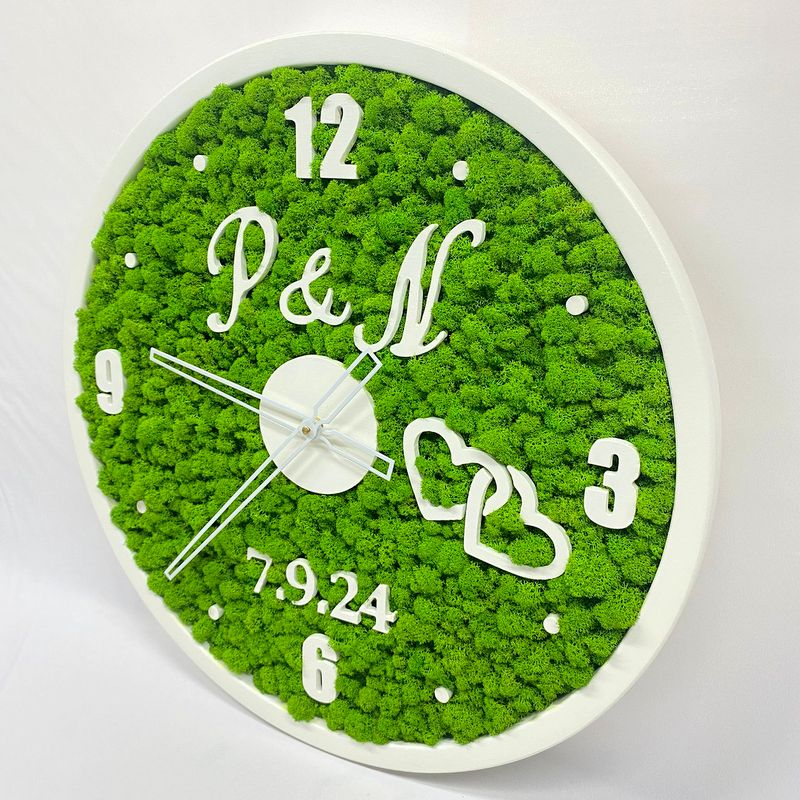 Model WEDDING je navrhnutý ako svadobný dar. Kombinuje biely rám so zeleným machom a môže byť doplnený iniciálami novomanželov alebo dátumom svadby. Hodiny symbolizujú neustály plynutie času a sú krásnou spomienkou na významný deň. Sú ručne vyrobené, tiché a úplne bezúdržbové.