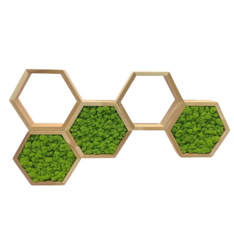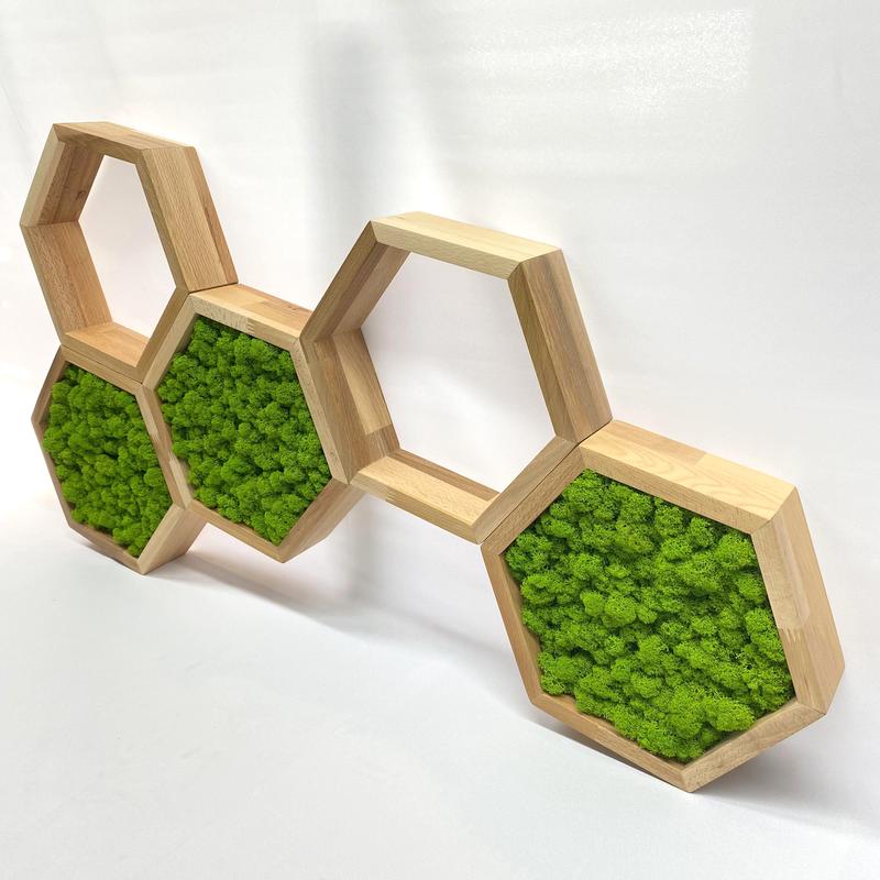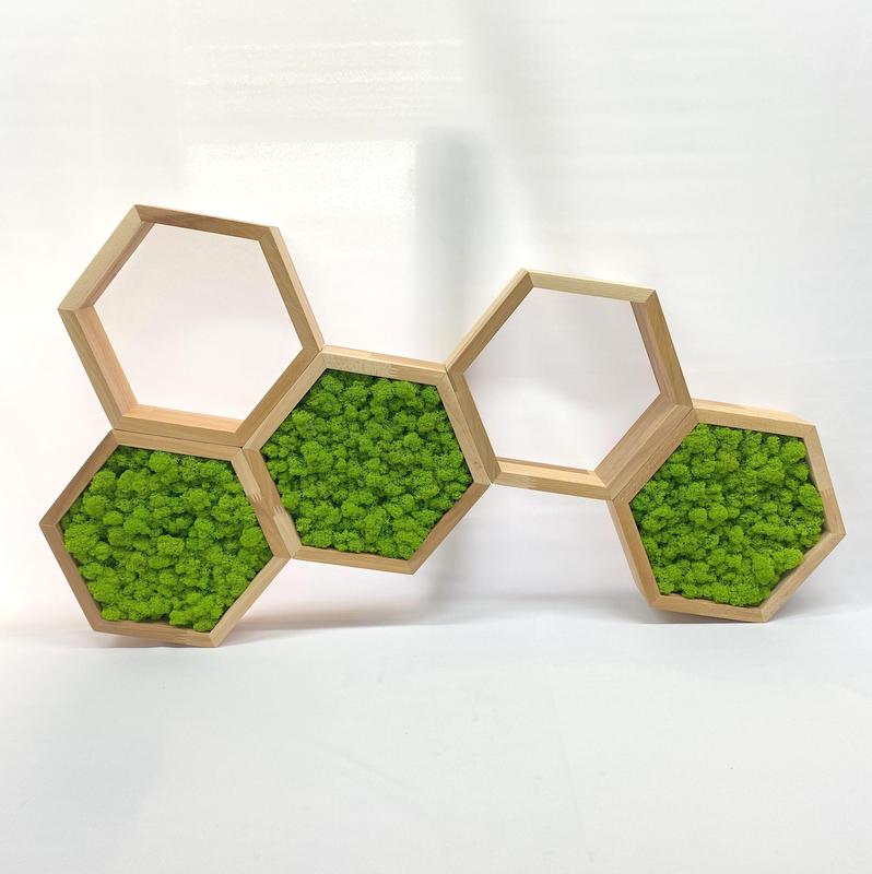 VČIELKA pozostáva z niekoľkých šesťuholníkových poličiek, ktoré môžete rôzne kombinovať. Zadnú časť alebo okraje zdobí stabilizovaný mach. Poličky sú praktické aj dekoratívne a hodia sa do detských izieb, kancelárií alebo kreatívnych priestorov.