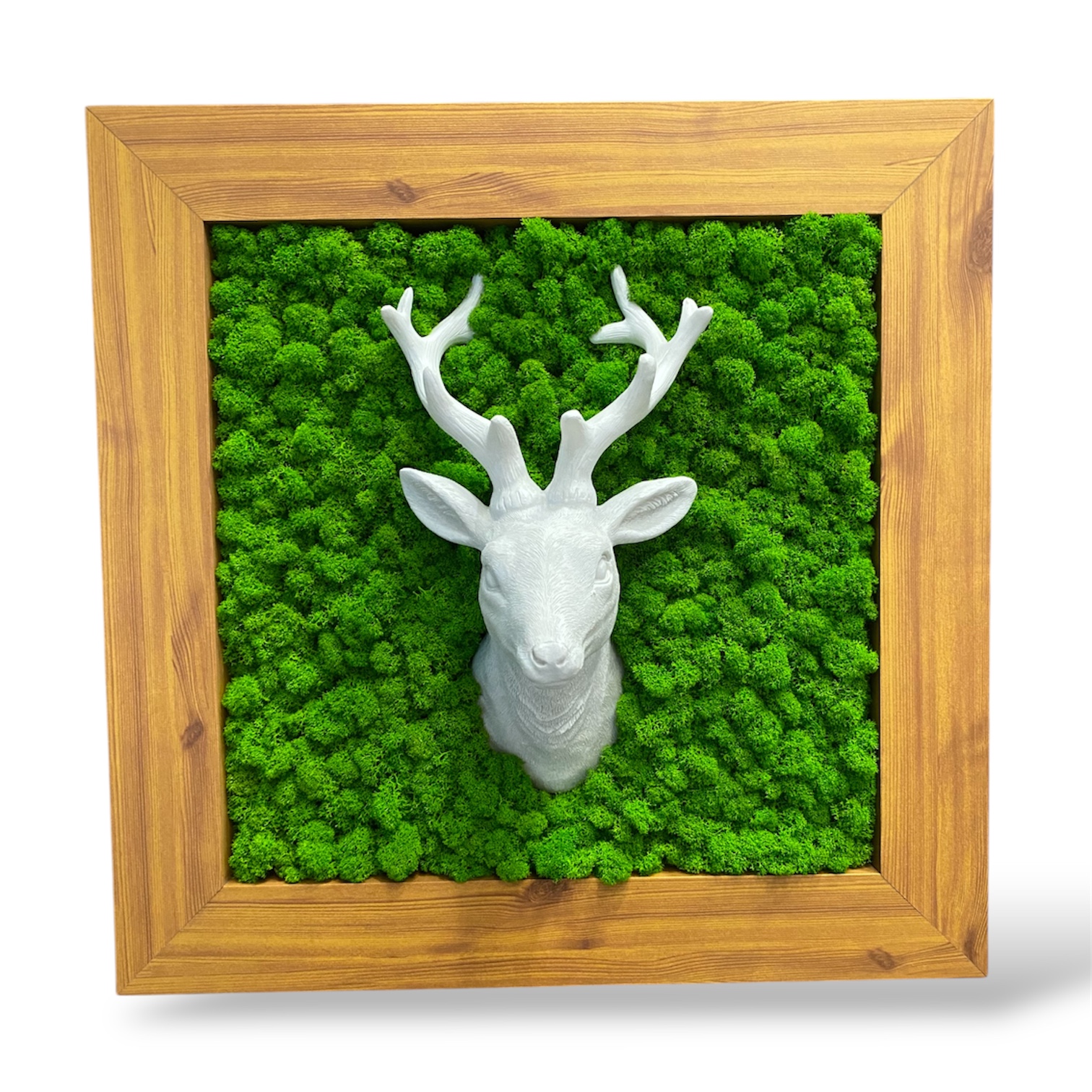 Soška jelena je vytvorená zo sadry na zelenom pozadí z machulišajnik. Obraz pôsobí rustikálne a je obľúbený medzi milovníkmi lesa a poľovníctva. Môžete si vybrať veľkosť a typ rámu. Je vhodný do chaty alebo obývacej izby.