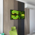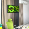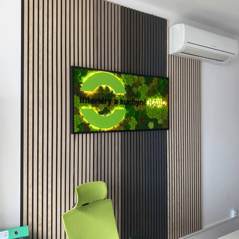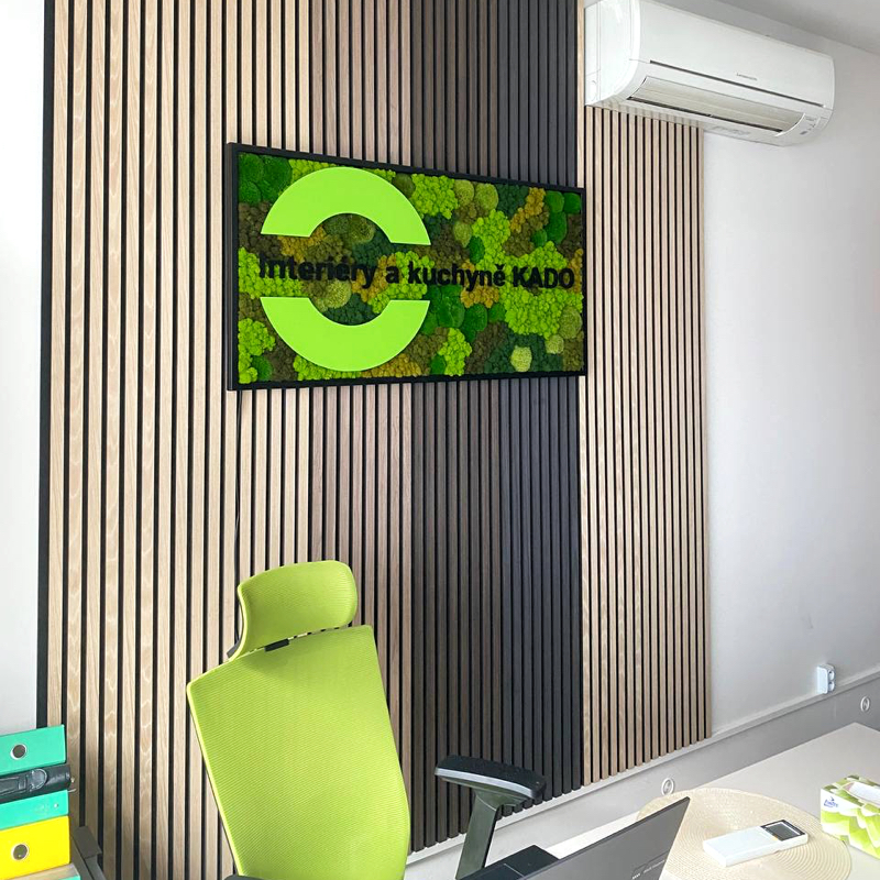Logo KADO je výnimočné svojim hravým tvarom a LED podsvietením. Základom je lišajník, ktorý poskytuje mäkký a objemný povrch, zvýraznený kopčekovým machom pre detaily. Machová textúra vytvára 3D efekt, ktorý priťahuje pohľady. Logo je ručne vyrobené a vyjadruje kreatívne zameranie značky.