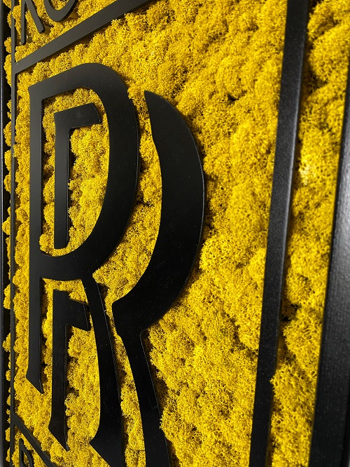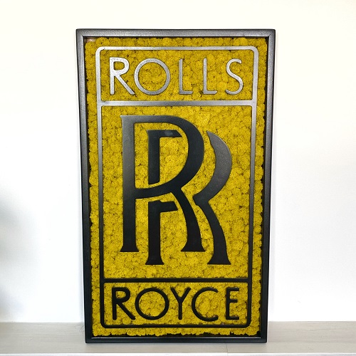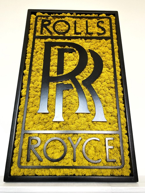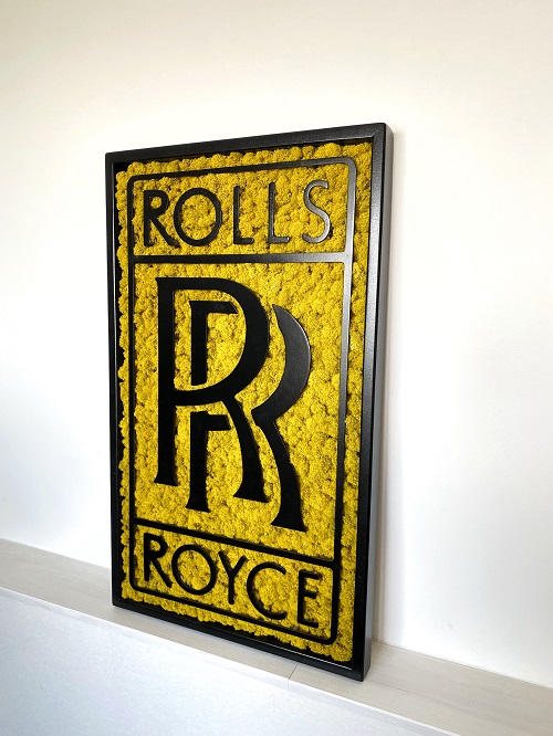 Prémiová značka Rolls‑Royce si žiada výnimočnú prezentáciu. Machový základ v kombinácii s čiernym rámom zdôrazňuje luxus a eleganciu. Toto logo je vhodné do showroomov či kancelárií poskytujúcich prémiové služby.