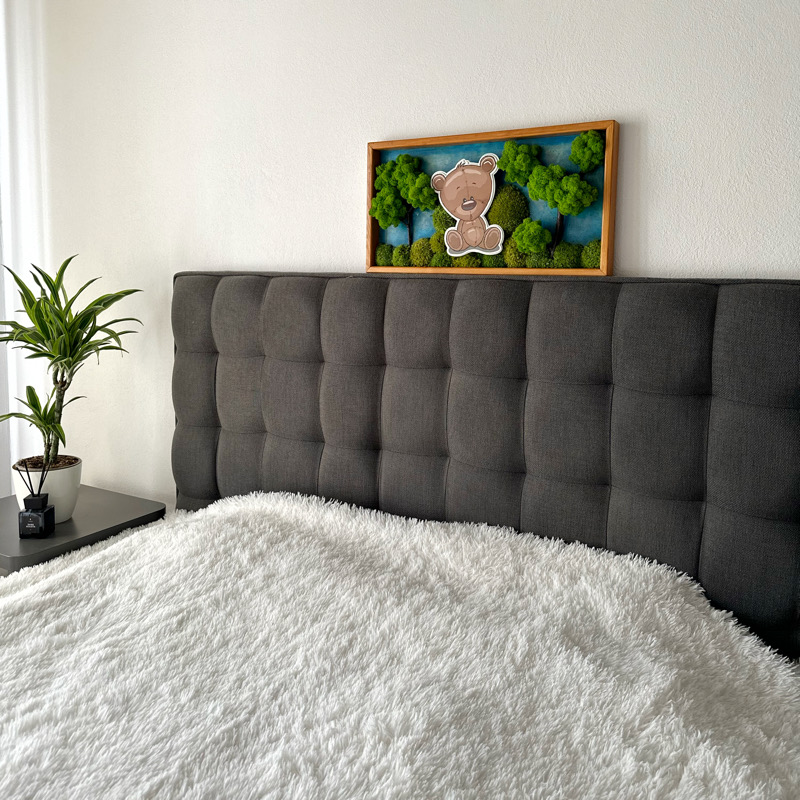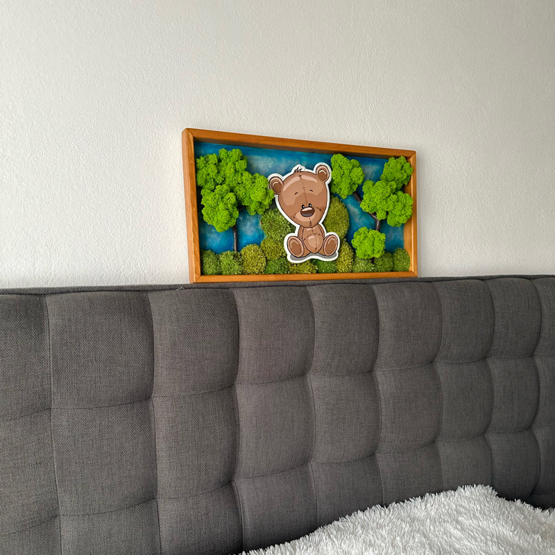 TEDDYBEAR je roztomilý medvedík vytvorený z mäkkého lišajníkového machu. Tento obraz je perfektný pre detskú izbu alebo ako darček k narodeniu dieťaťa. Vyberte si farby machu, aby medvedík ladil s interiérom. Obraz je ľahký, bezúdržbový a bezpečný.