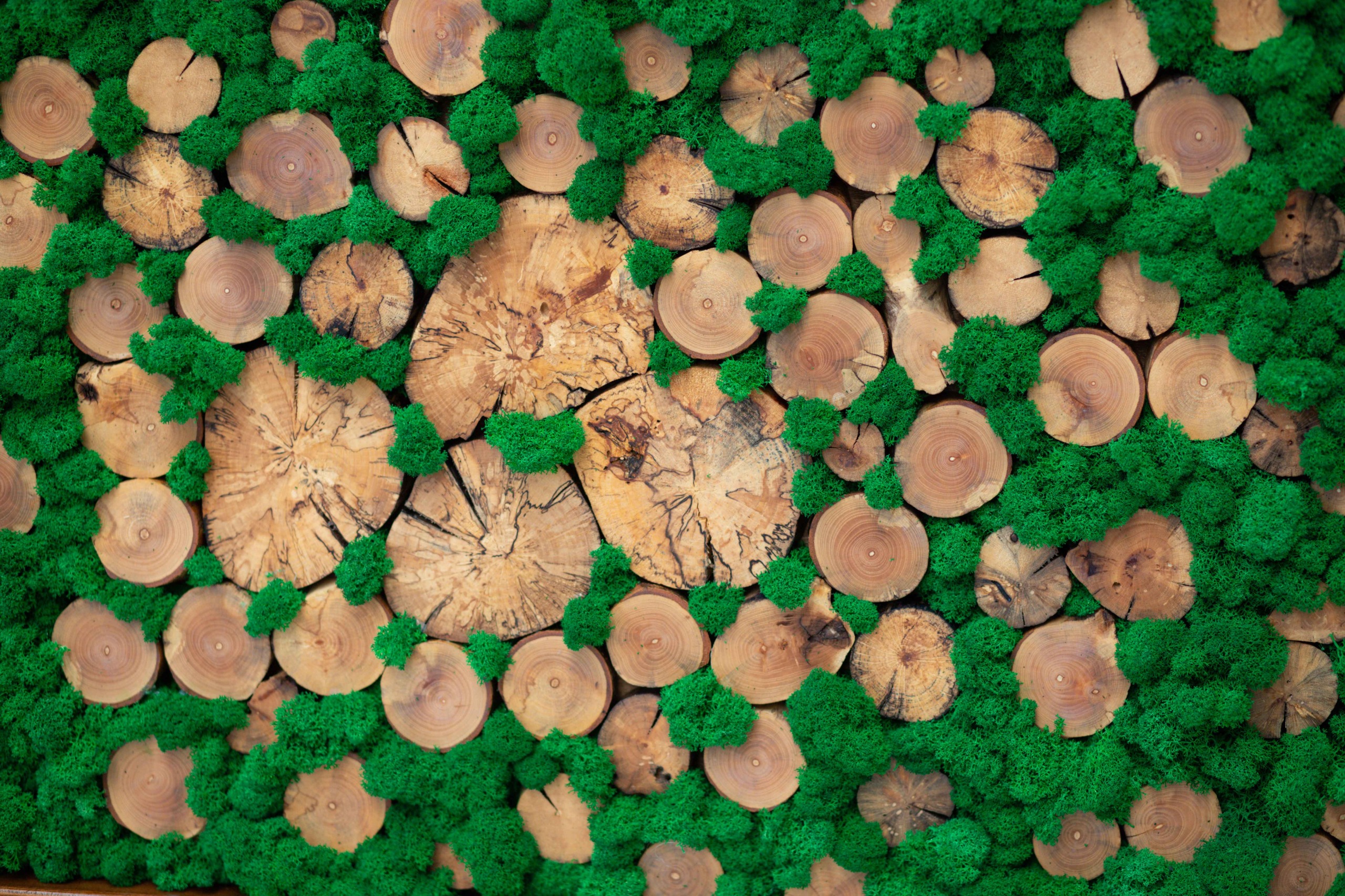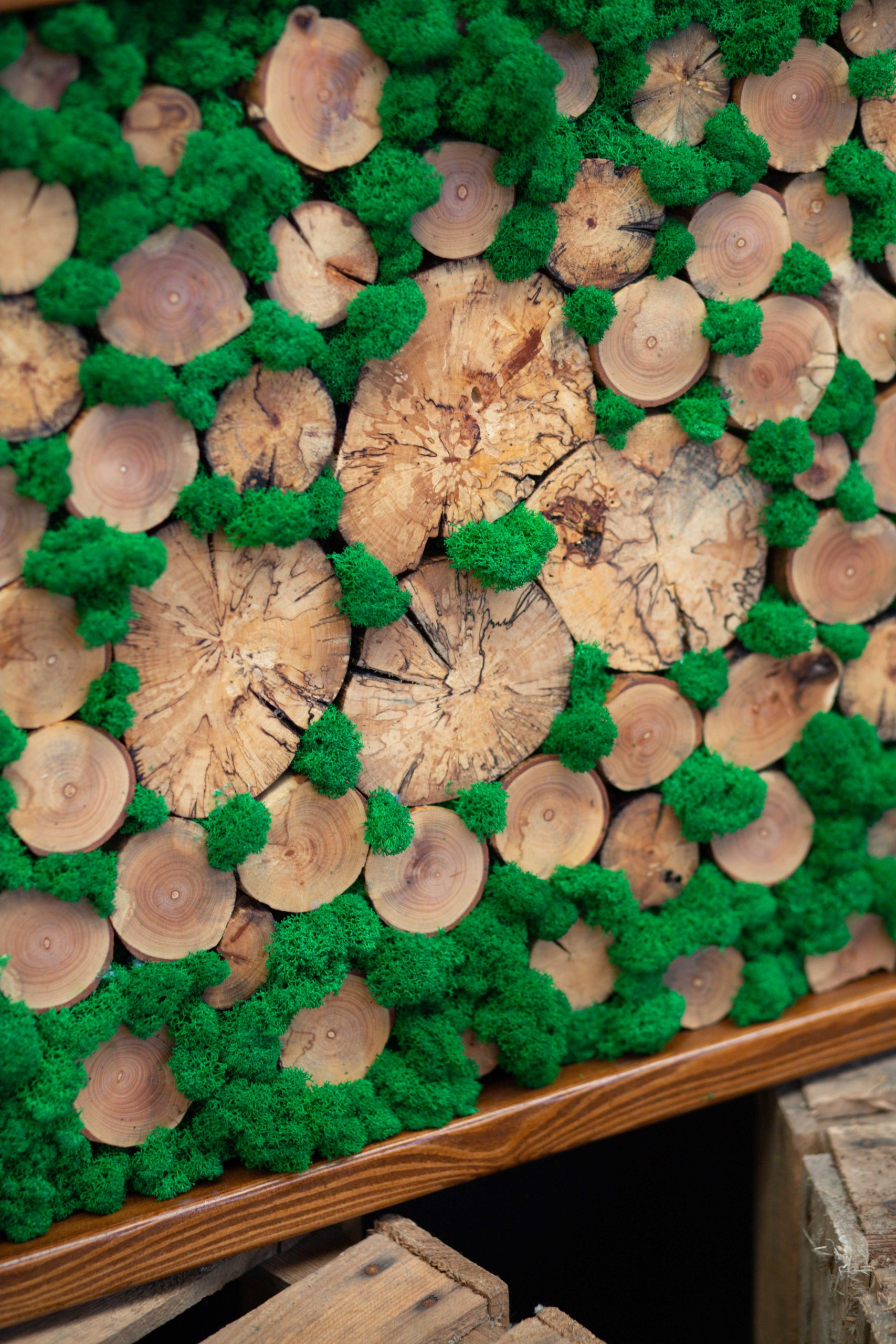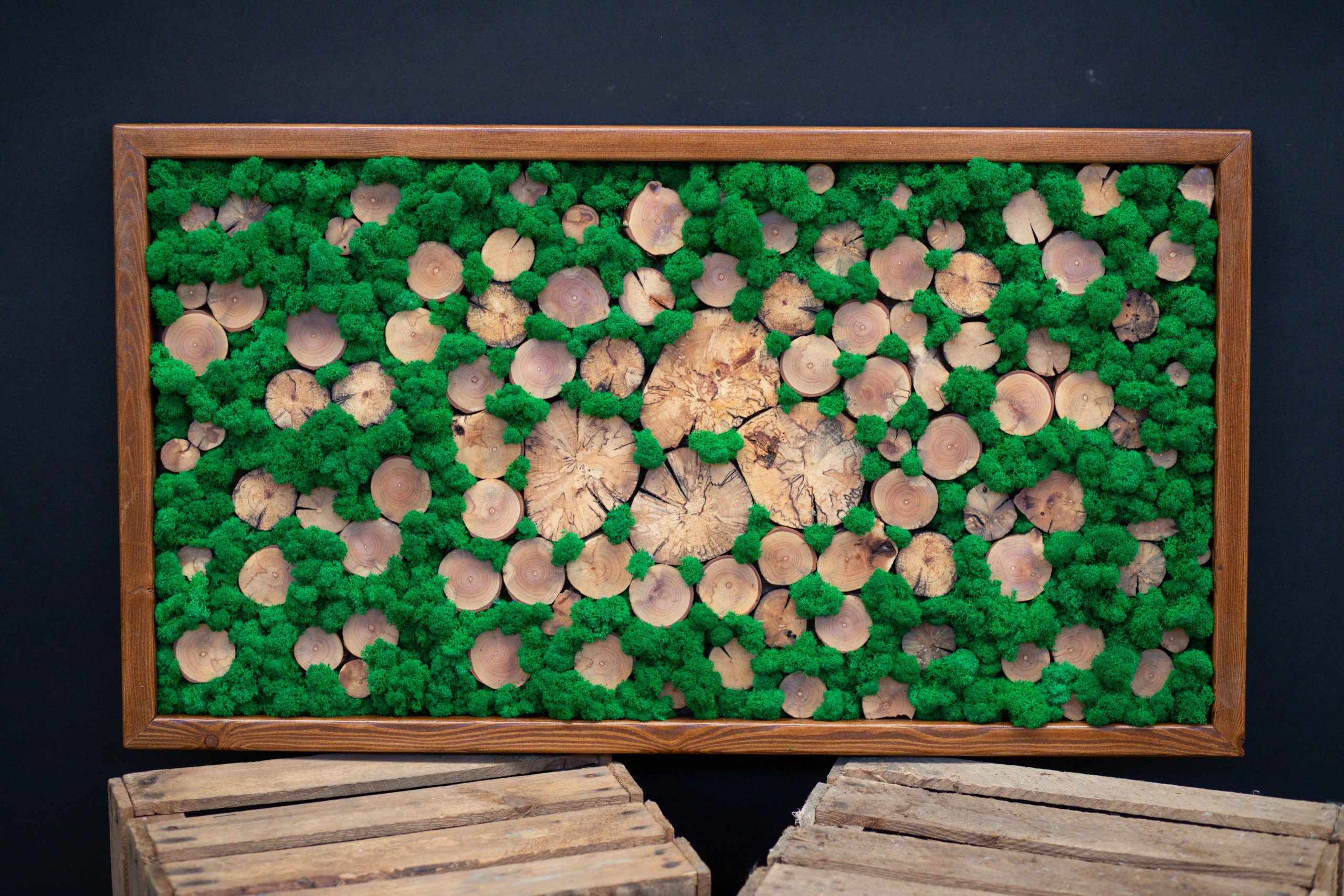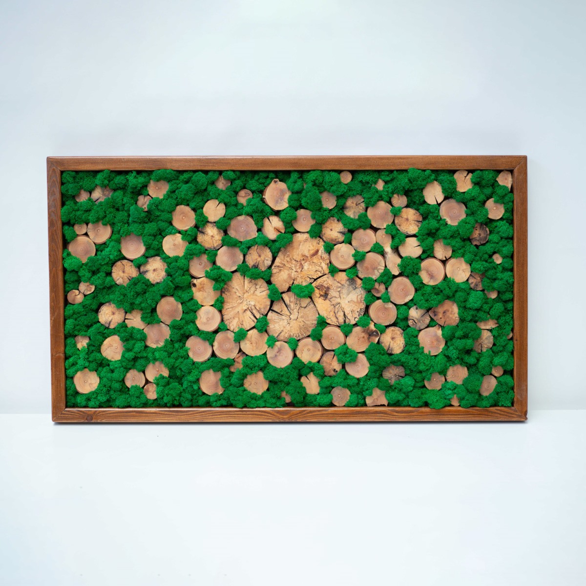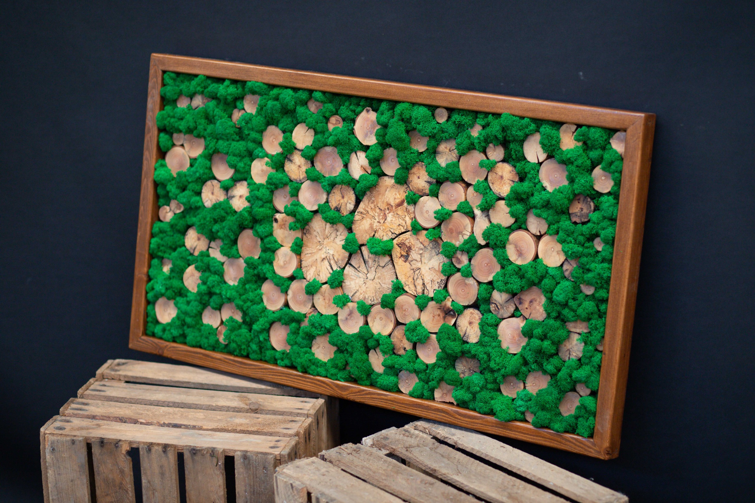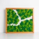 Machový obraz na dreve je inštalovaný priamo na masívnej drevenej doske, ktorej textúra zostáva viditeľná. Mach lišajnik pokrýva len vybrané časti, čím vytvára kontrast medzi zeleným materiálom a teplou farbou dreva. Tento obraz dodáva priestoru rustikálny a zároveň moderný nádych. Je vhodný do horských chát, ale aj do mestských loftov.