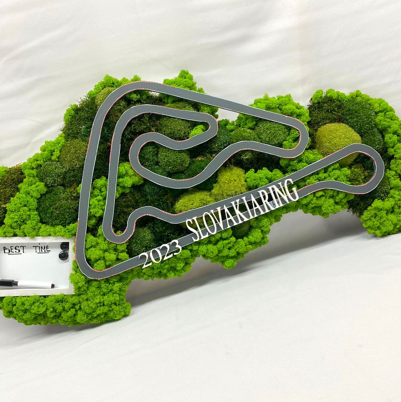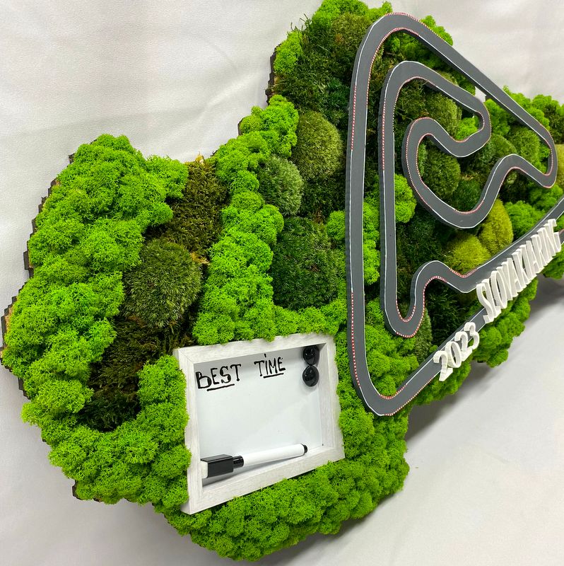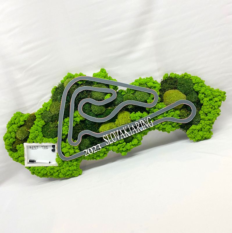 Tento obraz reprodukuje tvar známeho pretekárskeho okruhu Slovakiaring pomocou zeleného machu. Vynikne v miestnosti fanúšika motošportu alebo v lobby športového klubu. Materiály sú stabilizované a preto nevyžadujú žiadnu starostlivosť. Rám a veľkosť prispôsobíme podľa vašich predstáv.