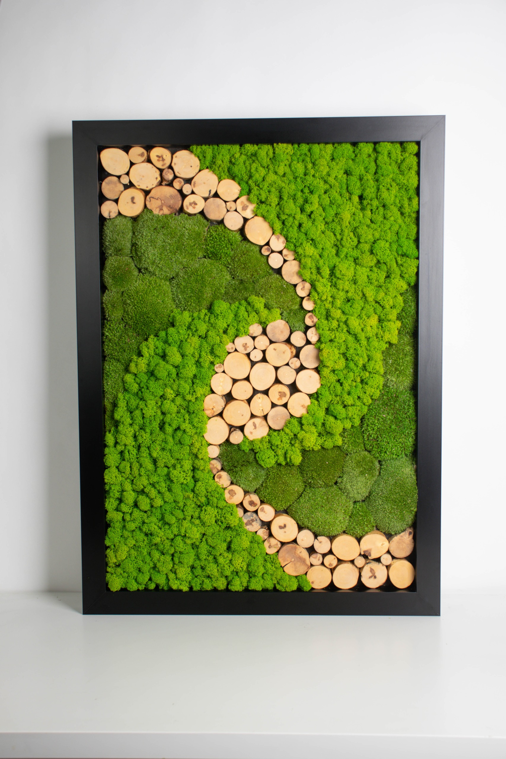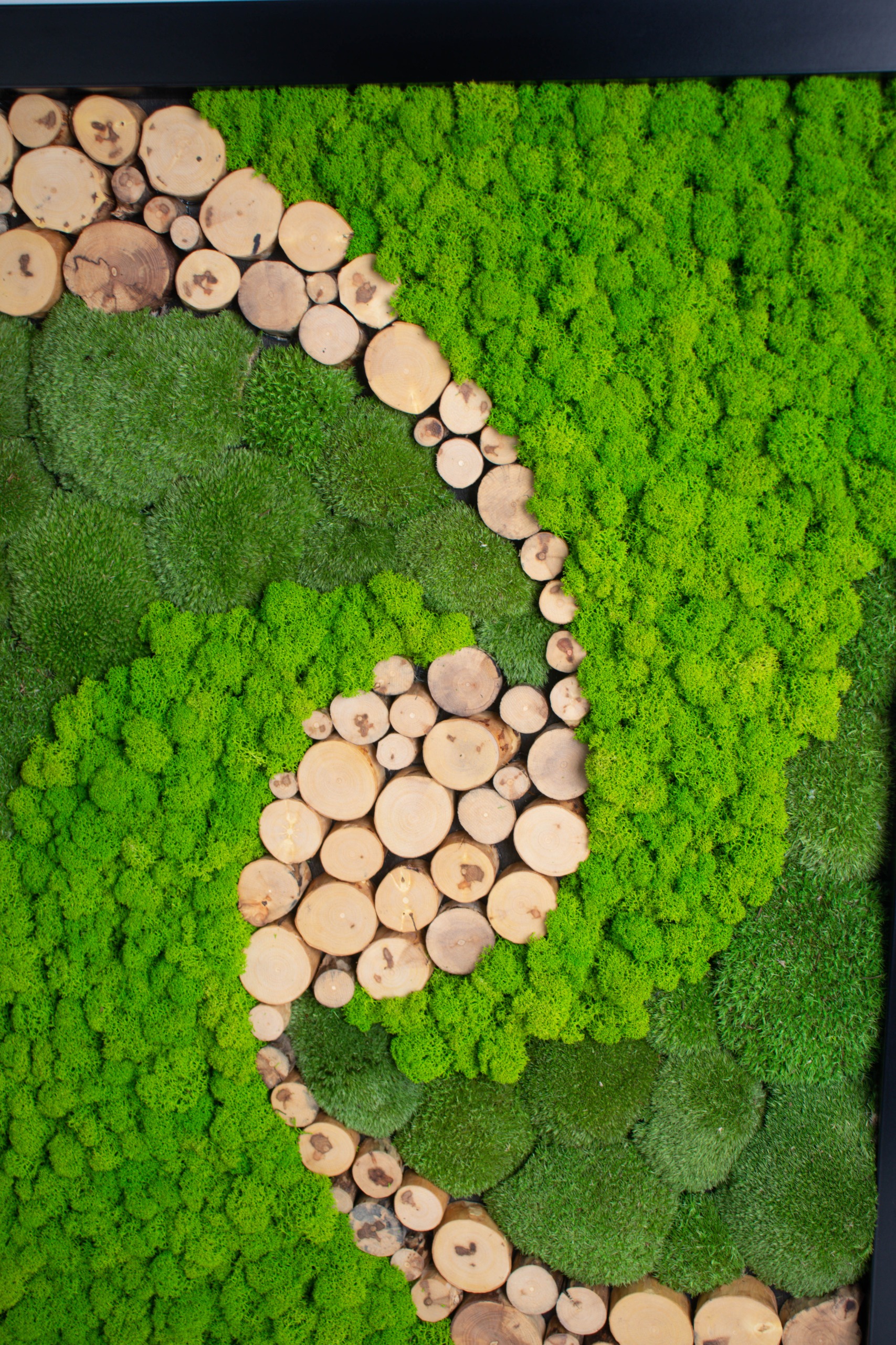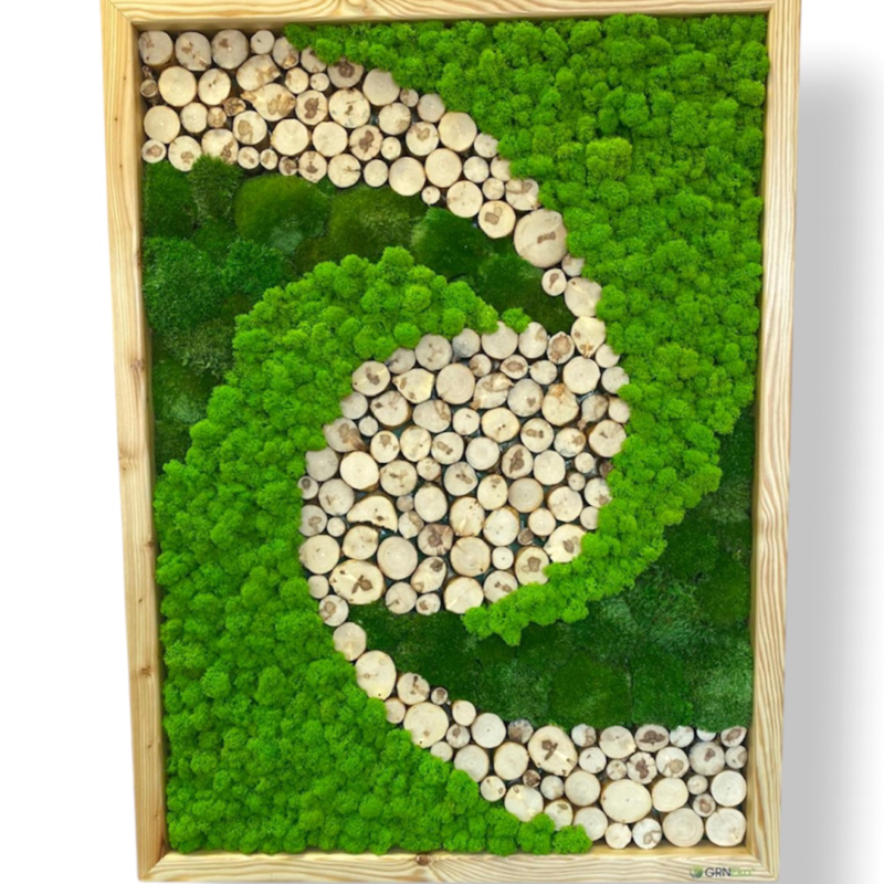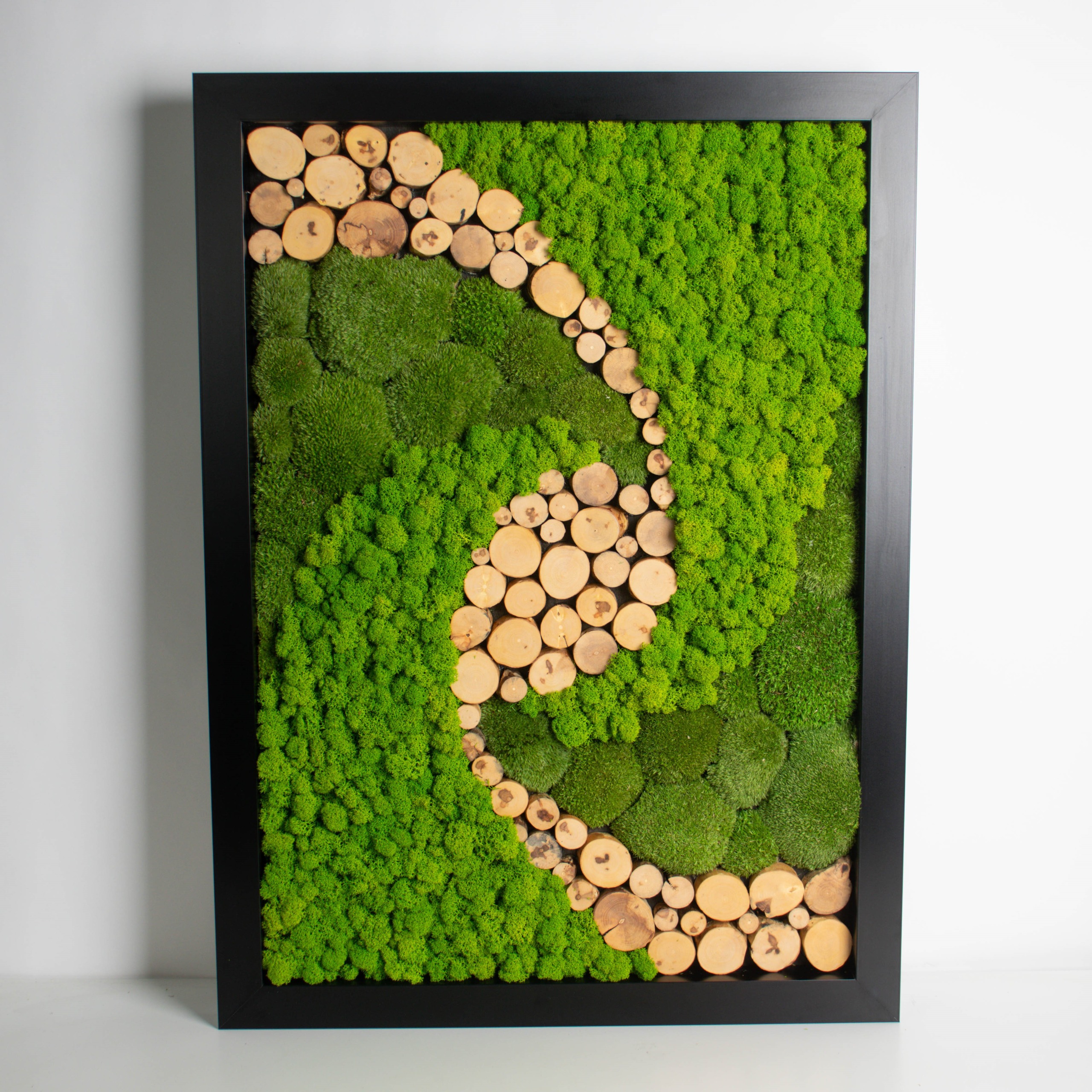 Na obraze ŠPIRÁLA sa vinie točitý pás machu od stredu smerom von. Kombinácia tmavého kopčekového a svetlého machu  lišajnik zdôrazňuje rotáciu. Tento motív symbolizuje neustály pohyb a vývoj, preto je vhodný do kreatívnych priestorov, štúdií alebo moderných obytných izieb. Obraz je vyrobený na mieru a nevyžaduje žiadnu starostlivosť.
