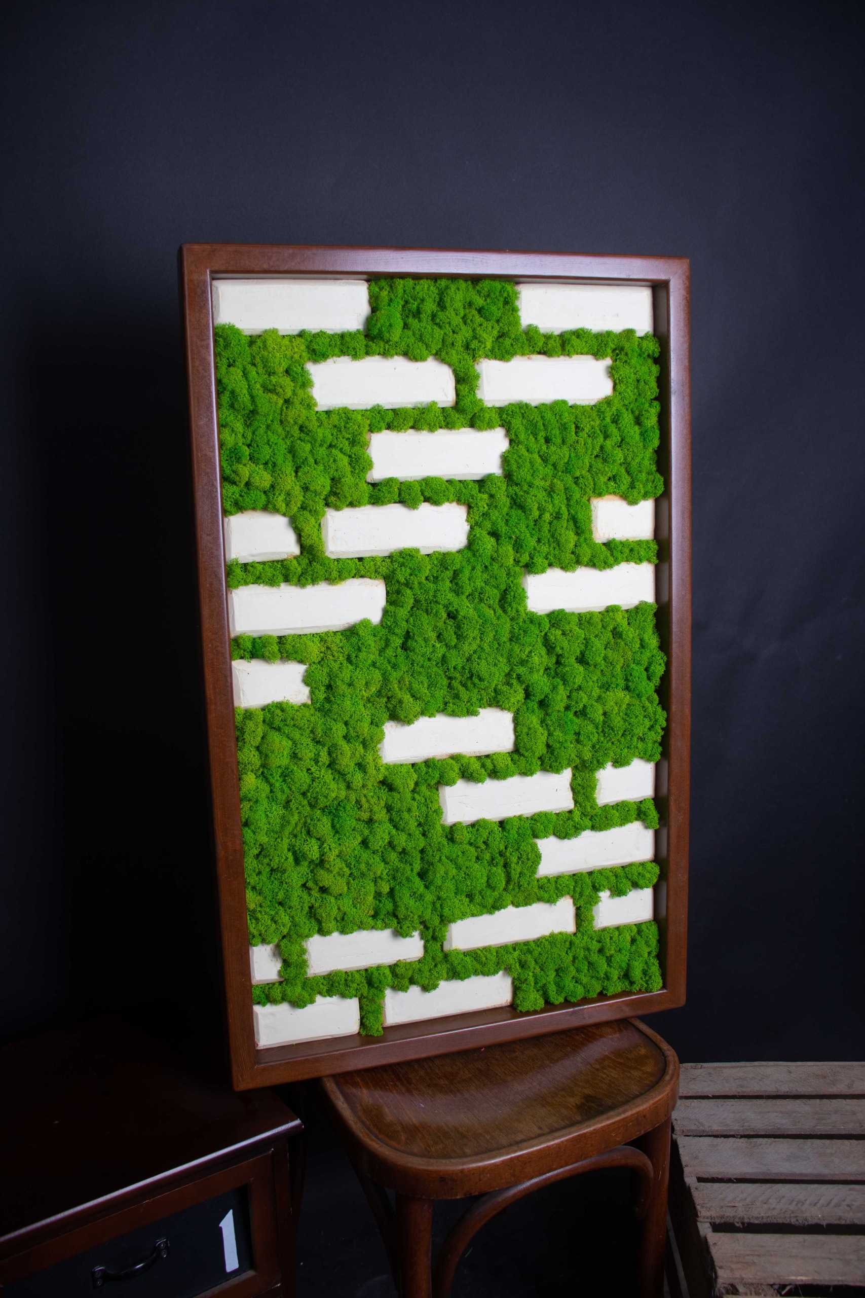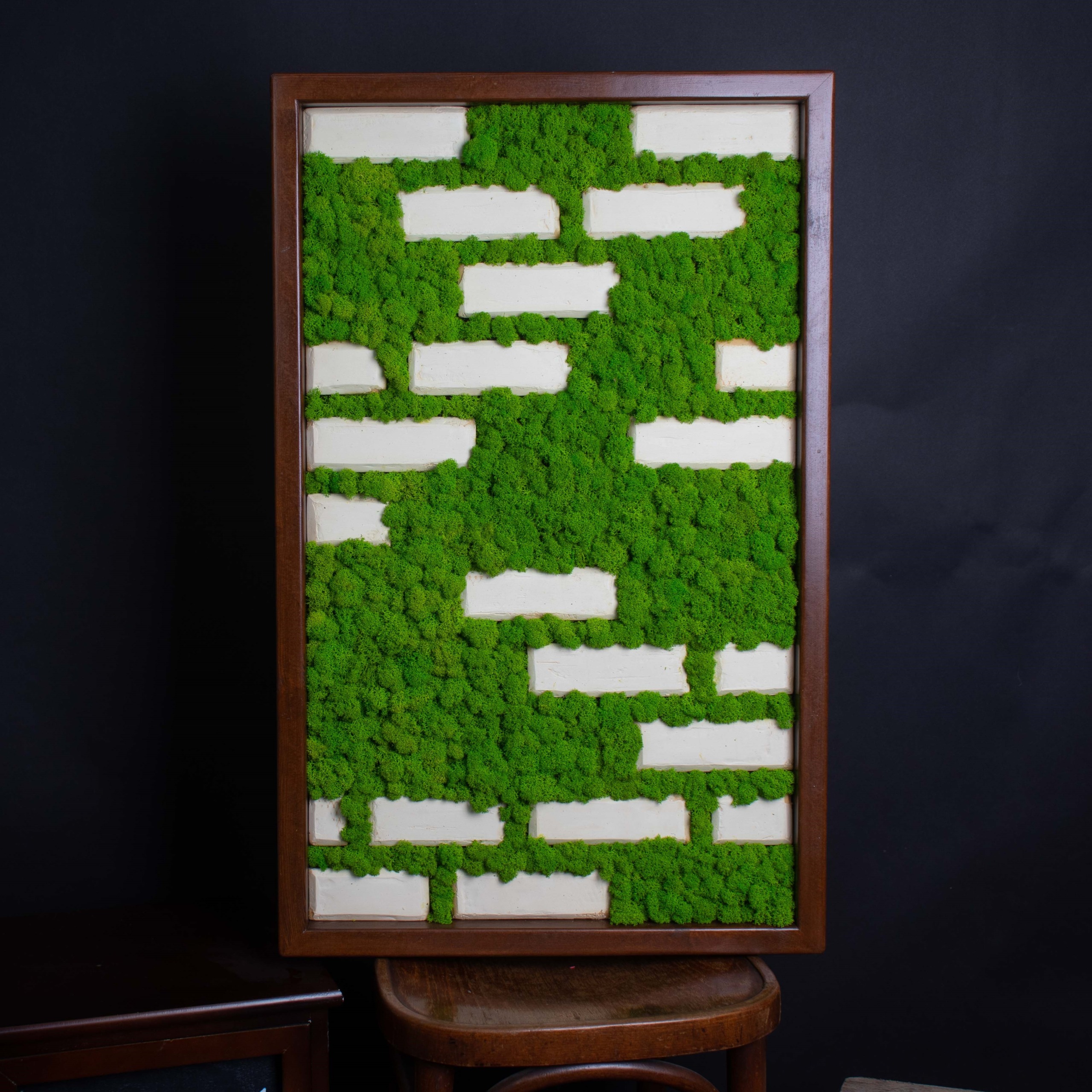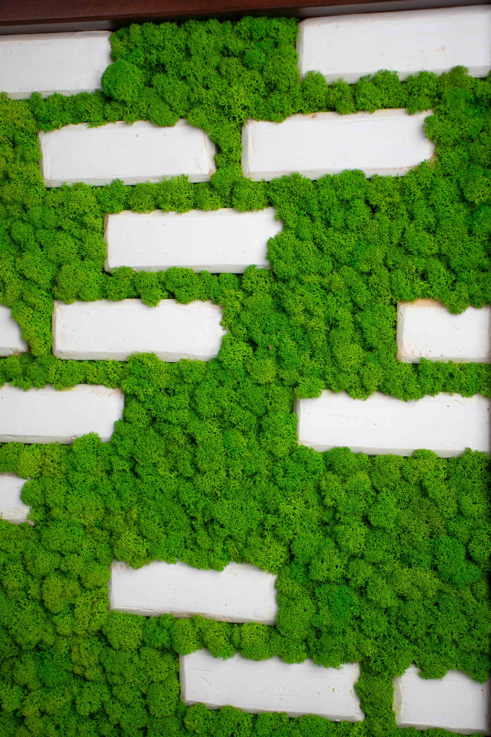 Tehličky využívajú striedanie machu lišajnik a tehličiek, aby vznikol dojem murovaného vzoru. Tento obraz vynikne v loftových bytoch, kanceláriách alebo reštauráciách, kde spojí industriálny štýl s prírodným materiálom. Je ručne vyrobený a bezúdržbový.