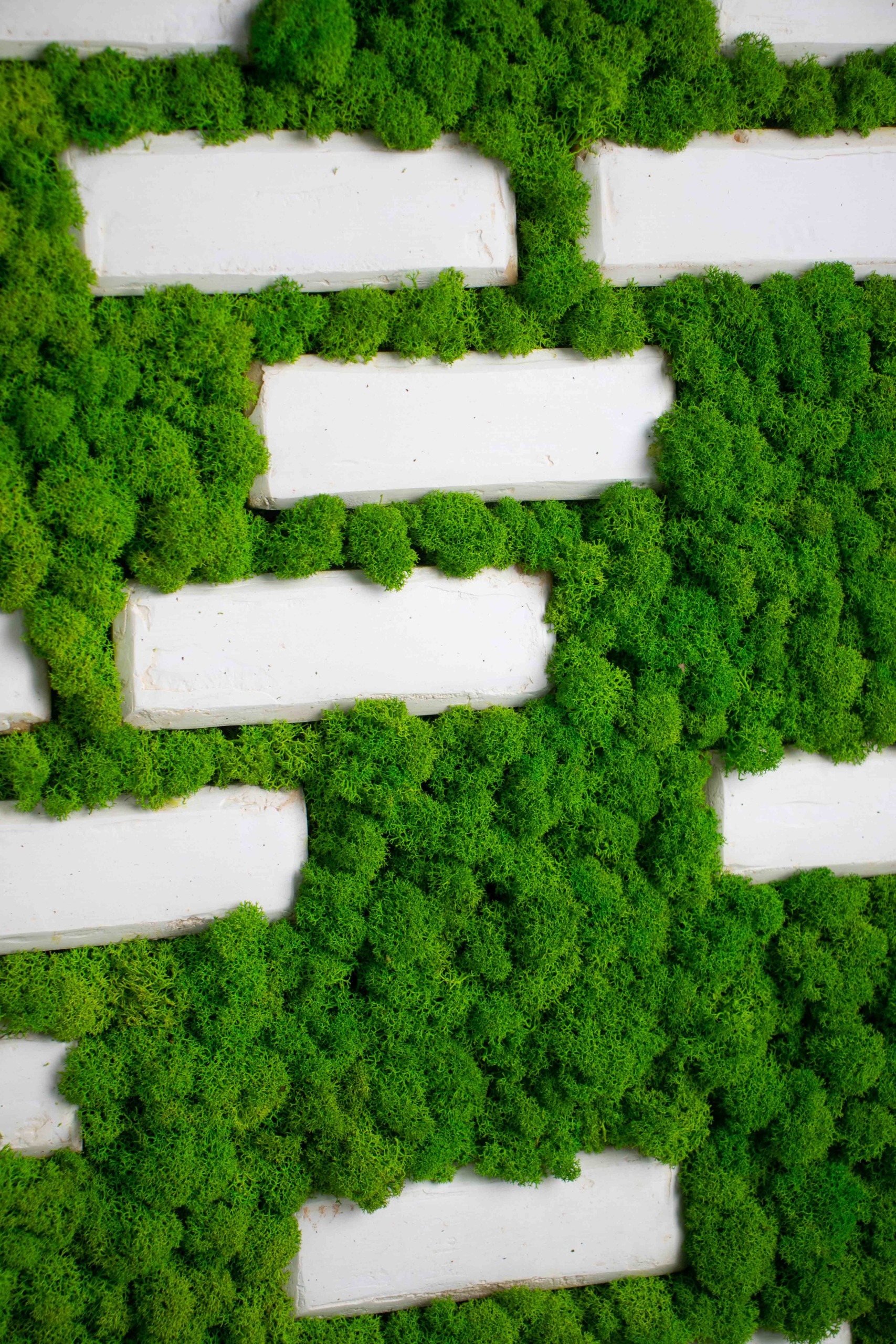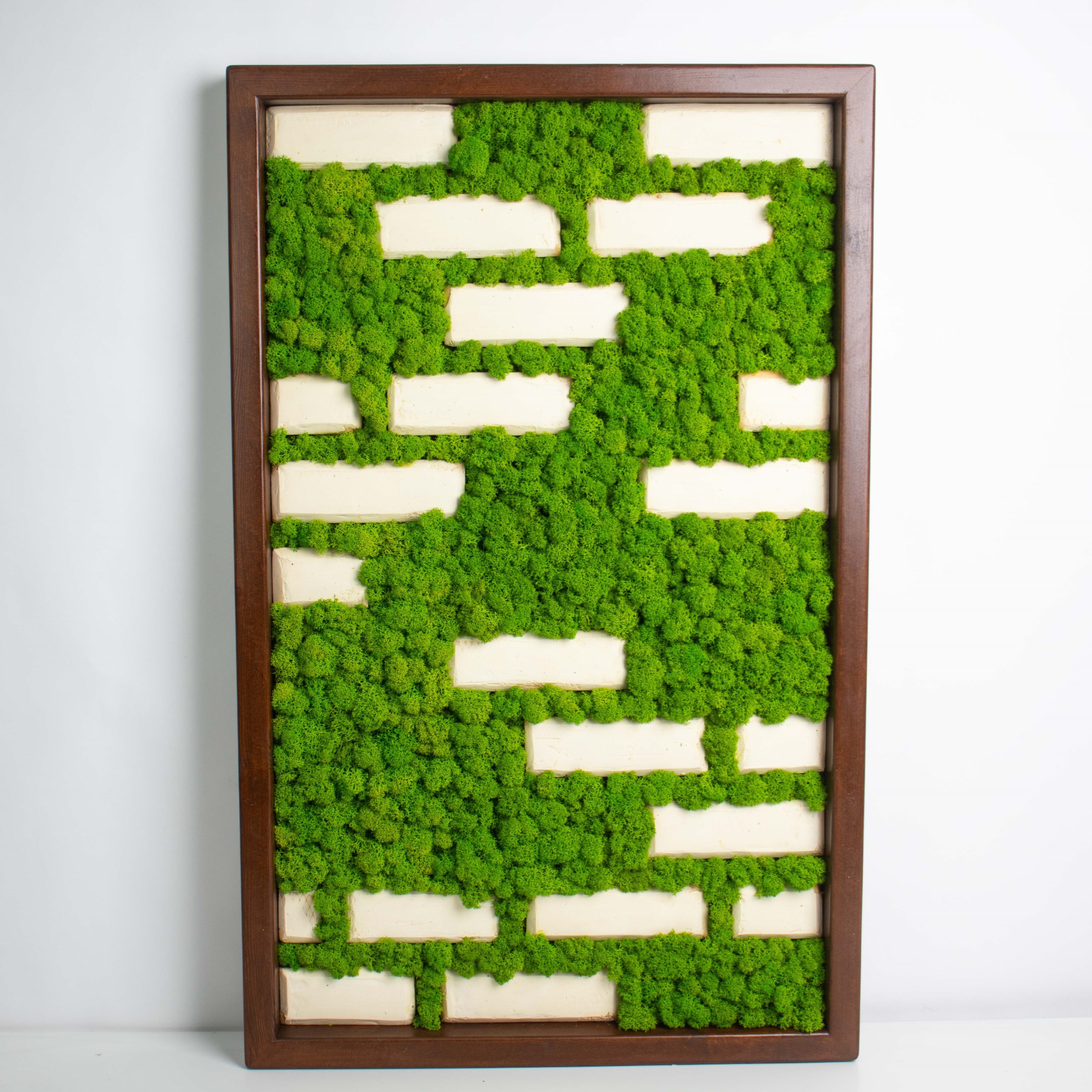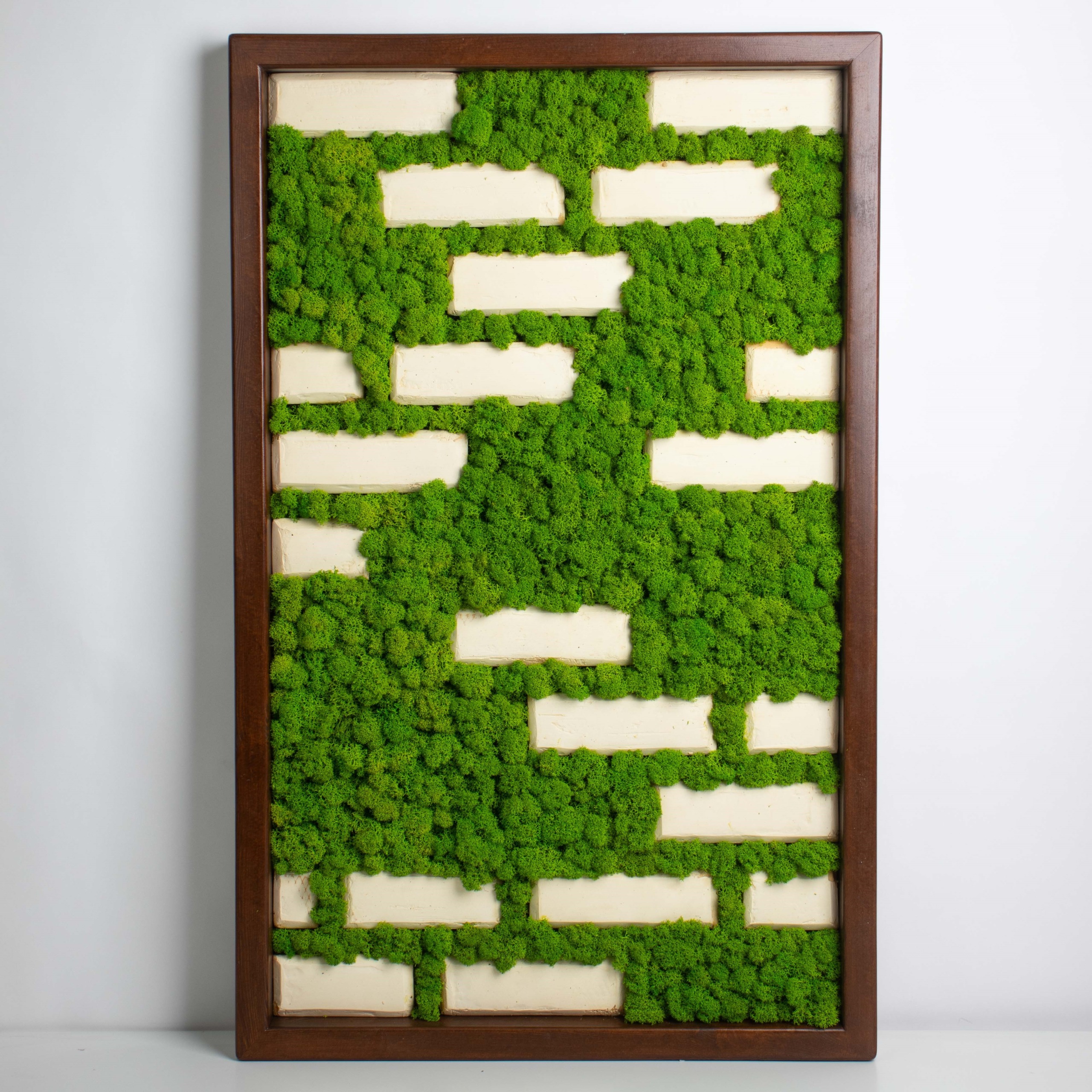 Tehličky využívajú striedanie machu lišajnik a tehličiek, aby vznikol dojem murovaného vzoru. Tento obraz vynikne v loftových bytoch, kanceláriách alebo reštauráciách, kde spojí industriálny štýl s prírodným materiálom. Je ručne vyrobený a bezúdržbový.